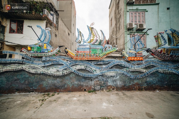 Con đường ven sông Hồng thuộc phường Phúc Tân (quận Hoàn Kiếm, Hà Nội) vốn là nơi tập hợp rác thải. Mùi xú uế bốc lên, từng xe rác nằm bộn bề, khiến mảnh đất xưa kia được biết đến là bãi bến thuyền lớn dưới chân cầu Long Biên, trông không khác gì một bãi rác. Nhận đề bài của UBND quận Hoàn Kiếm về việc "biến khu bãi rác thành điểm đến nghệ thuật" thuộc dự án "Cải tạo bờ bên lở sông Hồng", nhóm 16 nghệ sĩ cả trong và ngoài nước, đã thức tỉnh không gian sống thực thụ của bà con. Trong ảnh là tác phẩm "Thuyền" của nghệ sĩ Vũ Xuân Đông làm từ 10.000 chai nhựa, tạo thành 4 chiếc thuyền buồm gợi nhớ hình ảnh trên bến dưới thuyền rộn rịp ở bãi sông Hồng cách đây hơn 100 năm.